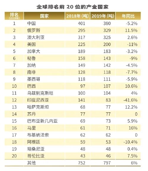 7月28日,《全球黄金年鉴2020》(中文版)发布。《年鉴》对2019年全球黄金全产业链进行总结、概括和提炼,并对2020年黄金的生产与消费、投资进行了展望。2019年,全球黄金总供应量上升2%,至4831吨,全球矿产黄金产量同比下滑1%,至3534吨,年产量10年来首度下降。同时,《年鉴》公布了全球排名前20位的产金国家。中国以380吨连续13年蝉联冠军。